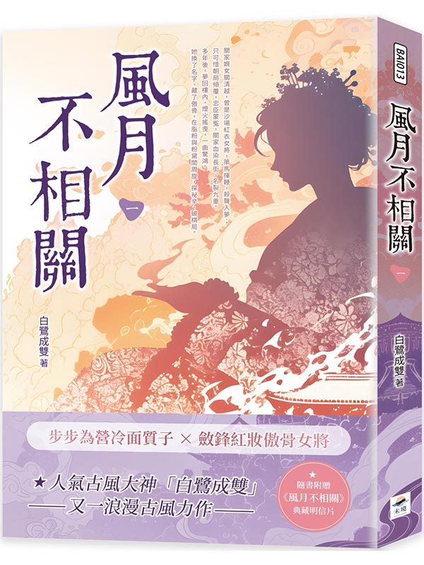 風月不相關(一) 內容簡介 步步為營冷面質子 × 斂鋒紅妝傲骨女將 ★人氣古風大神「白鷺成雙」又一浪漫古風力作 ★隨書附贈《風月不相關》典藏明信片 關家嫡女關清越,曾是沙場紅衣女將,策馬揮鞭,殺聲入夢; 只可惜朝局傾覆,忠臣蒙冤,關家血染長街、名裂九重。 多年後,夢回樓內,燈火搖曳,一曲驚鴻。 她換了名字、藏了傲骨,在脂粉與粉黛間周旋,探祕辛、破棋局。 - 他是澧國質子殷戈止,冷眼看盡朝堂與人心,為蒼生為信義,更為心中無人能及的那道身影。 初見那日,她從天而降砸他滿頭胭脂香。 再見,她一笑撩人,卻滿心算計。 - 「公子想聽琴,我會彈啊!想下棋,我奉陪啊!什麼詩書畫歌舞茶,您要什麼奴家就能給您來什麼!十兩銀子一夜,看你長得好,給你打個八折吧!」 嫌棄地揮開她的手,殷戈止冷笑連連:「妳這樣的人,就別侮辱琴棋書畫了。」 妳這樣的人。 風月聽著,恍惚間覺得周圍變得虛無,光芒散去,黑暗之中有聲音遠遠而來,在她耳邊溫柔地道: 「妳這樣的人,就該去上陣殺敵,瞧這一雙手,摸著半點沒有女兒家的柔軟。」 「妳這樣的人,怎麼會自薦枕蓆於人?分明生澀得緊,嗯,是處子?」 「妳這樣的人……真是心狠,要走了也不讓我看一看長什麼樣子?」 年少不懂事的大膽痴纏,意氣風發地私定終身,黑暗裡的無休止的溫情,都像是她做過的一場美夢,在滅門的慘禍和這麼多年的漂泊之中,散得連碎片都沒了。 本書特色 步步為營冷面質子 × 斂鋒紅妝傲骨女將 關家嫡女關清越,曾是沙場紅衣女將,策馬揮鞭,殺聲入夢; 只可惜朝局傾覆,忠臣蒙冤,關家血染長街、名裂九重。 多年後,夢回樓內,燈火搖曳,一曲驚鴻。 她換了名字、藏了傲骨,在脂粉與粉黛間周旋,探祕辛、破棋局。