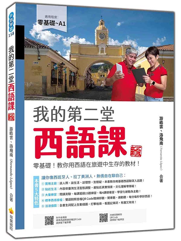 作者簡介 游皓雲 25年前因為想看懂中南美洲的棒球,便熱血地學起西班牙語,越學越覺得自己上輩子應該就是講西班牙語的人。曾到西班牙求學一年、多明尼加教書兩年,認識瓜地馬拉籍的另一半後,西班牙語果然成了要講一輩子的語言。 師大華語教學研究所碩士,語言教學經歷累積19年,專職教臺灣人西班牙語,也教世界各國的外國人士華語,學生國籍超過74個國家。是多國語言愛好者,在新竹與先生洛飛南共同創辦「雲飛語言文化中心」。著有《我的第一堂西語課》、《我的第二堂西語課》、《我的第三堂西語課》、《我的第四堂西語課》、《每天10分鐘,聽聽西語人怎麼說》、《我的第一堂華語課》(以上均由瑞蘭國際出版)、《懂語感,無痛學好任一種外語》(時報出版)。 個人部落格:www.yuhaoyun.world 洛飛南 Fernando López 瓜地馬拉籍,在臺灣專職教西班牙語。2013年與太太在新竹創辦雲飛語言文化中心,教學時數累積10,000小時。 在瓜地馬拉主修工業工程,曾任瓜地馬拉高中教師,來臺後獲取交通大學GMBA碩士。碩士畢業後發現自己最大的熱情還是教學,除了基礎西語之外,也融合工程、商業背景,為學生客製化商務西語課程。 著有《我的第一堂西語課》、《我的第二堂西語課》、《我的第三堂西語課》、《我的第四堂西語課》和《每天10分鐘,聽聽西語人怎麼說》,並為「Esta pareja 台瓜夫妻」及「Chino para negocios 商業中文」兩個podcast的主持人之一,希望這本書能夠幫助更多臺灣學習者學好自己的母語。 個人部落格:www.fernandolopez.world